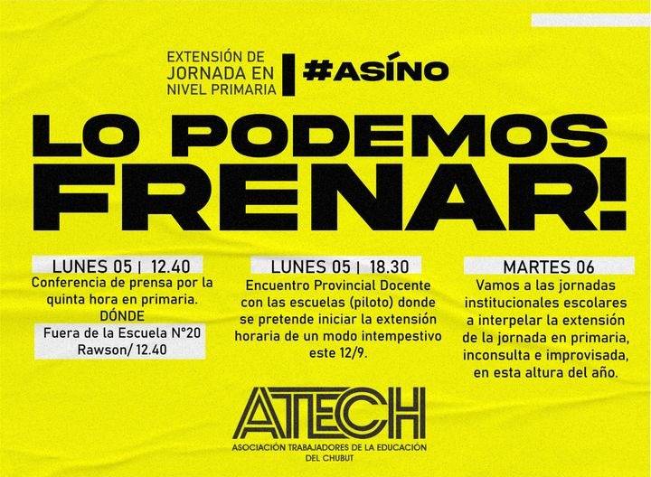 Luego del paro y movilización llevado a cabo la semana pasada en toda la provincia, la Asociación de Trabajadores de la Educación de Chubut (ATECH) realiza asambleas en diversas escuelas para debatir sobre la quinta hora de clases que dio a conocer el Gobierno Provincial.