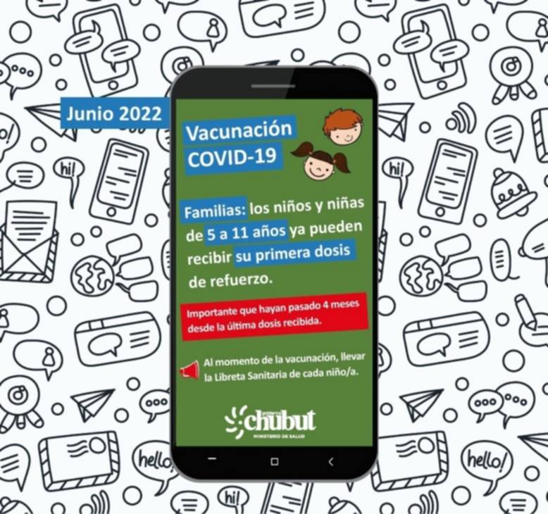El Gobierno del Chubut, a través del Ministerio de Salud, que conduce Fabián Puratich, informó que ya se encuentra disponible en todos los vacunatorios de la provincia la primera dosis de refuerzo de la vacuna contra Covid-19 para los niños y las niñas de 5 a 11 años de edad, que ya hayan completado su esquema de vacunación inicial hace por lo menos 120 días.