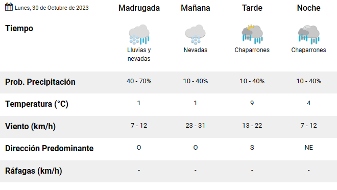La jornada comienza con nevadas y vientos de 13 y 22 kilómetros. Luego, en horas de la tarde, se esperan chaparrones que se extenderán hasta la noche, acompañados con una temperatura de 4°C.