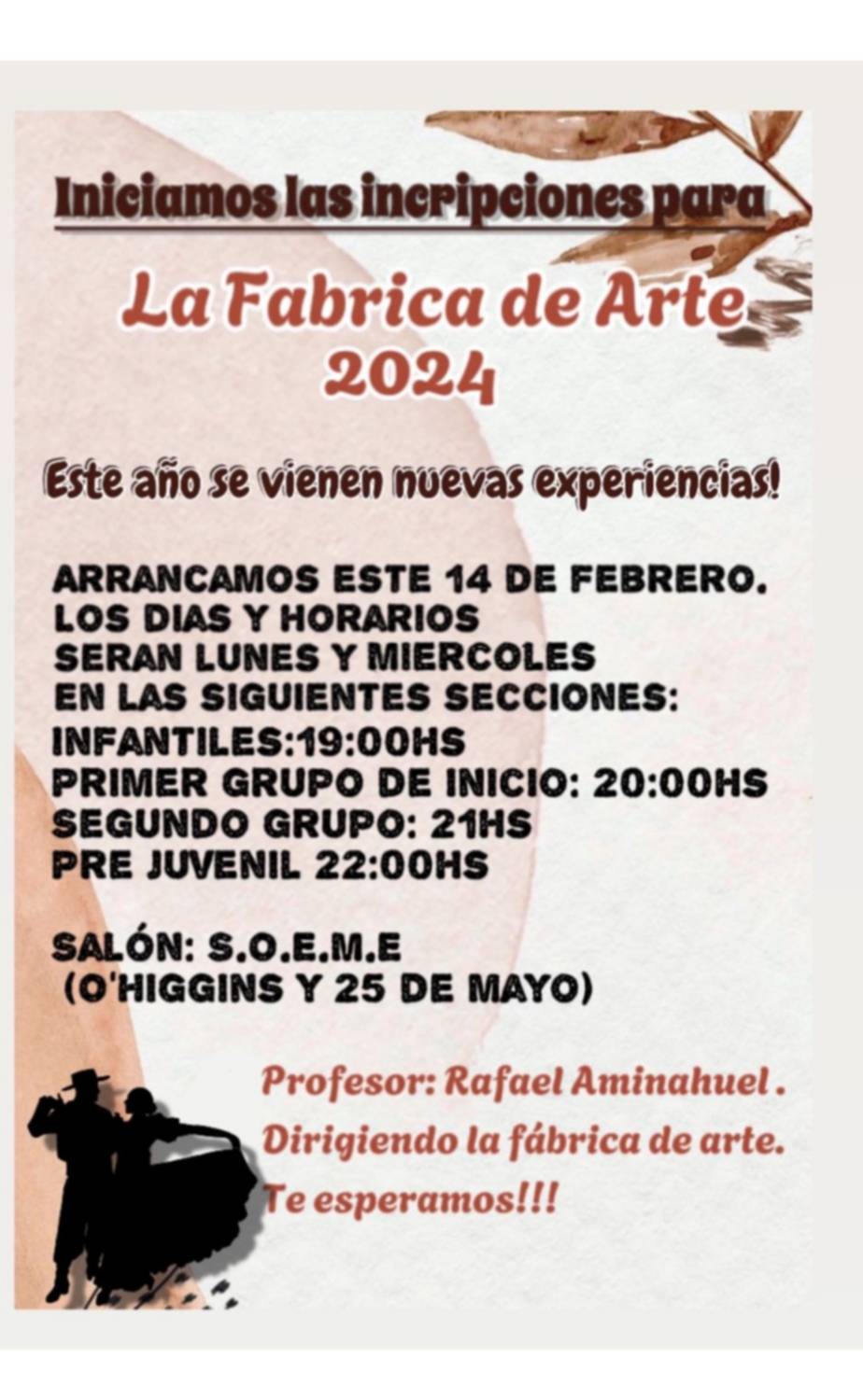 Aquellas personas que deseen asistir a las clases de la Fábrica del Arte comunicarse al 2945 50-1069 (Rafael Aminahuel)