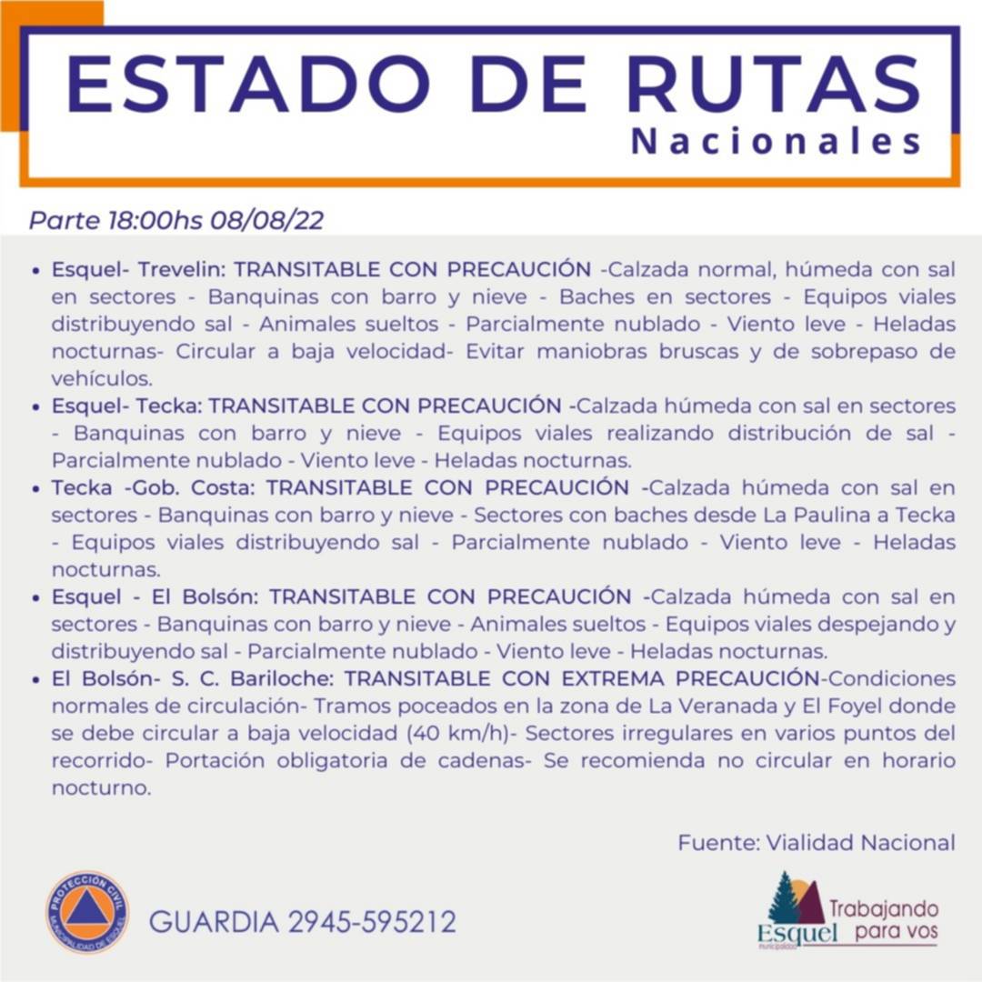 En este sentido, se informó que la Ruta Nº 259 que conecta Esquel -Trevelin, se encuentra transitable con precaución por la calzada húmeda.