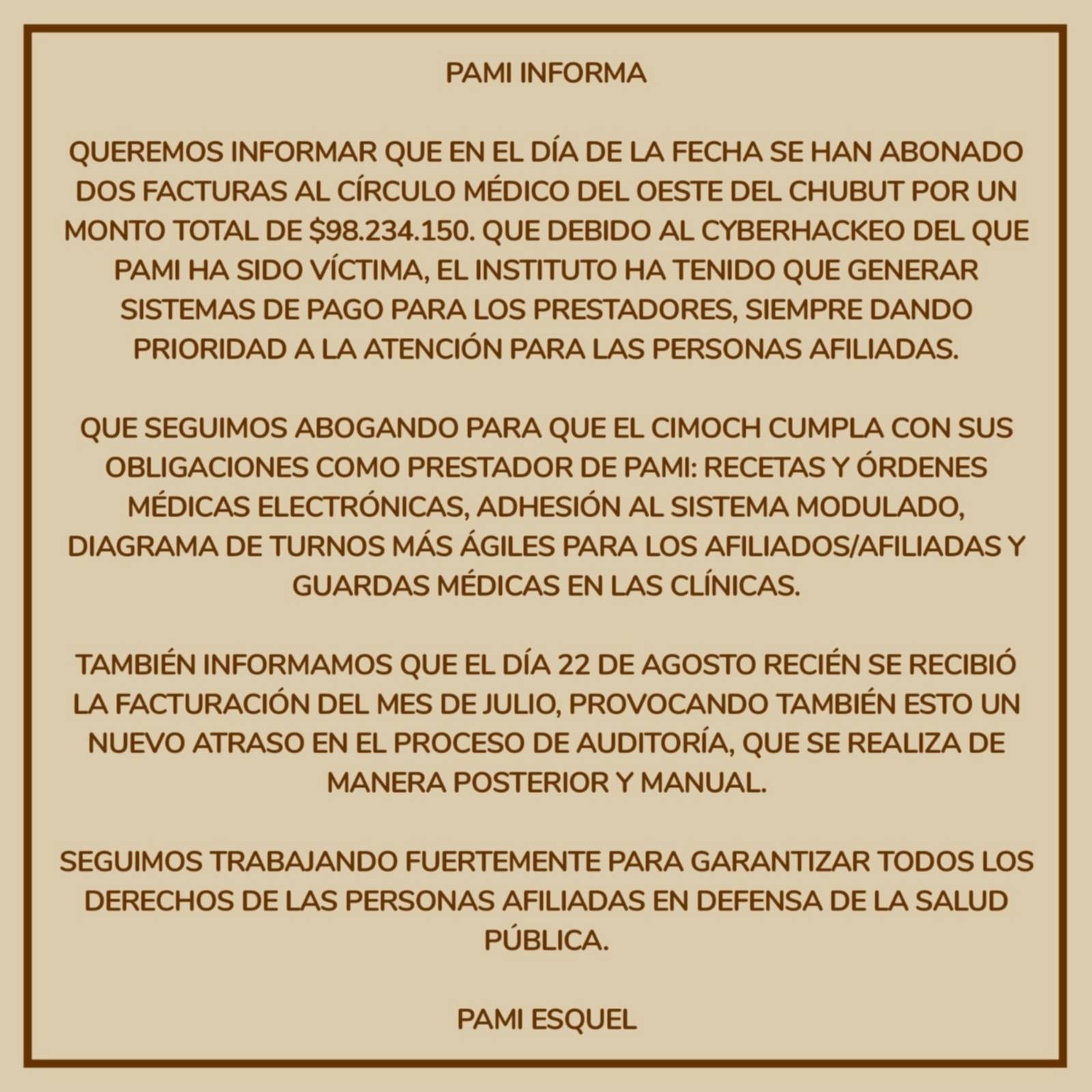 Este viernes, desde PAMI Esquel informaron que se hizo el pago de las facturas adeudadas al Círculo Médico del Oeste del Chubut. Este inconveniente, produjo una serie de cortes de servicio por parte del CIMOCH a los afiliados a PAMI desde hace varios días.