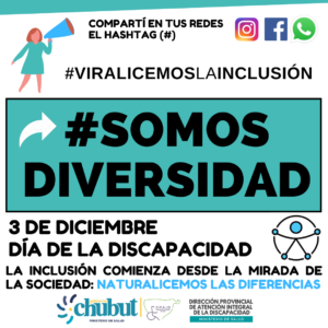 En el marco del Día Internacional de las Personas con Discapacidad, que se celebra cada 3 de diciembre, la Dirección Provincial de Atención Integral de la Discapacidad, dependiente del Ministerio de Salud de Chubut, invita a la comunidad provincial a sumarse a la campaña #SomosDiversidad, y a participar también de las distintas actividades conmemorativas que estarán realizándose en cada municipio.
