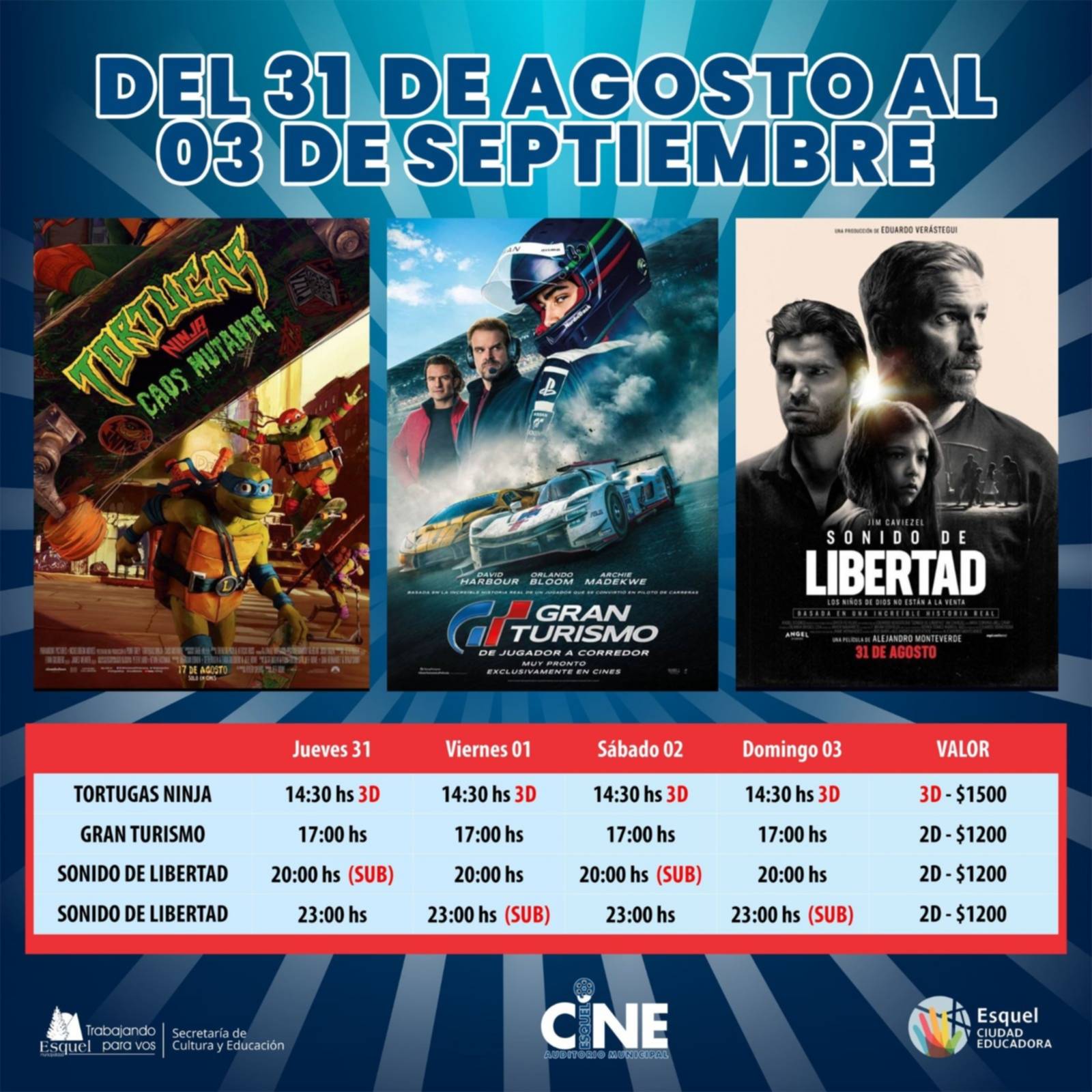 Desde la Municipalidad de Esquel confirmaron la nueva cartelera del Cine en la ciudad previsto desde el jueves 31 de agosto.