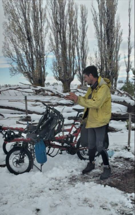 Una familia francesa se dirigía en bicicleta hacía Tierra del Fuego y su trayecto fue interrumpido por las condiciones climáticas, quedando varados a 60 kilómetros de Gobernador Costa, al costado de la ruta, por la nieve. Decidieron acampar para luego retomar el recorrido rumbo a la provincia.
