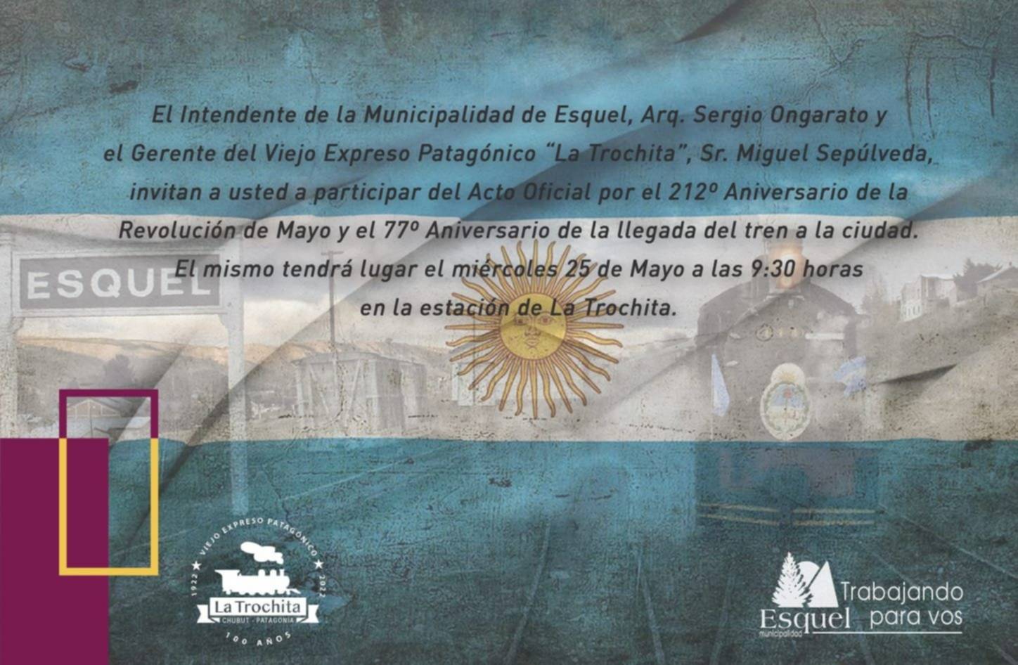 El próximo 25 de mayo se llevará a cabo un acto patrio en el predio del Viejo Expreso Patagónico «La Trochita» por el 212° Aniversario de la Revolución de Mayo.