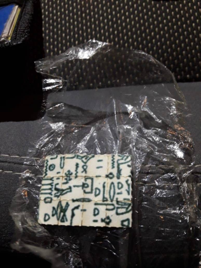 Por el hecho, se revisó el vehículo y detectaron en una billetera un envoltorio de nylon transparente que tenía una plancha con 48 dosis, de color blanco con líneas en color verde oscuro, presuntamente LSD.