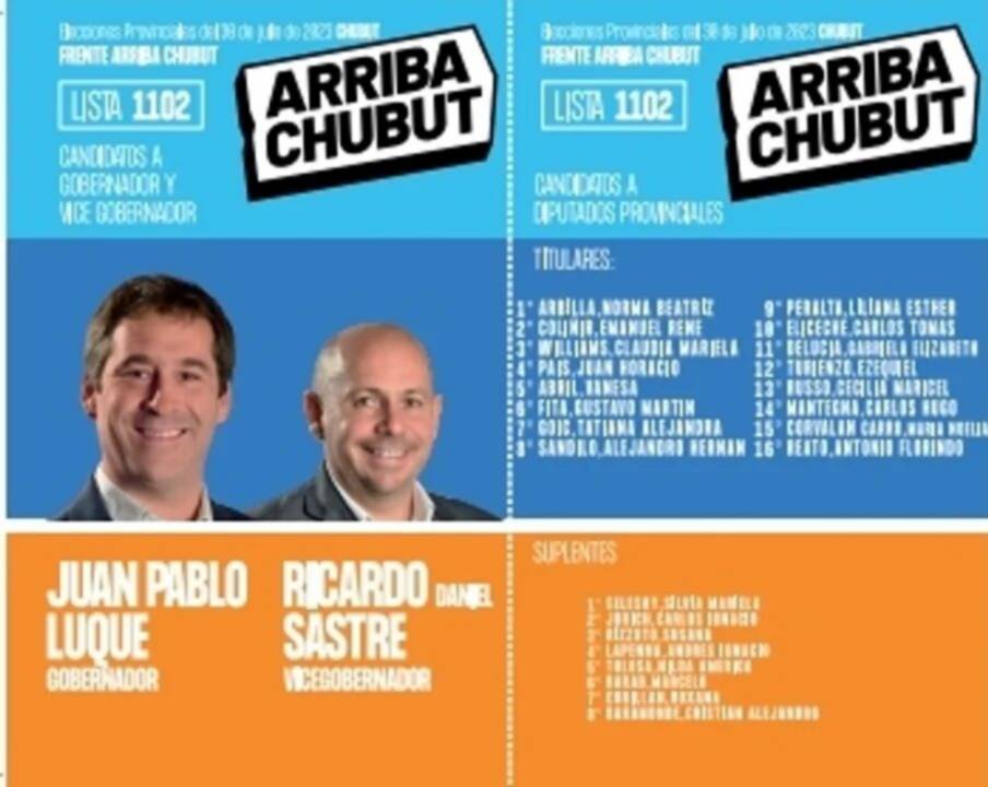 La boleta encabezada por Juan Pablo Luque y Ricardo Sastre lleva el número de lista 1102 y predominan el color naranja, azul y celeste, con los nombres en letras blancas y con la marca de la alianza en blanco y negro.