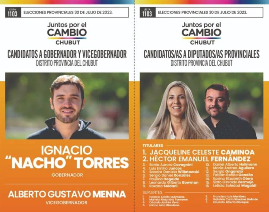 La alianza que lleva la fórmula Ignacio «Nacho» Torres y Gustavo Menna (encabezado por su primer nombre Alberto) lleva el número de lista 1103 y sus colores son naranja y blanco, con la clásica banda multicolor del espacio en la parte superior. Las fotos de Jacqueline Caminoa y Emanuel Fernández están arriba en Diputados.