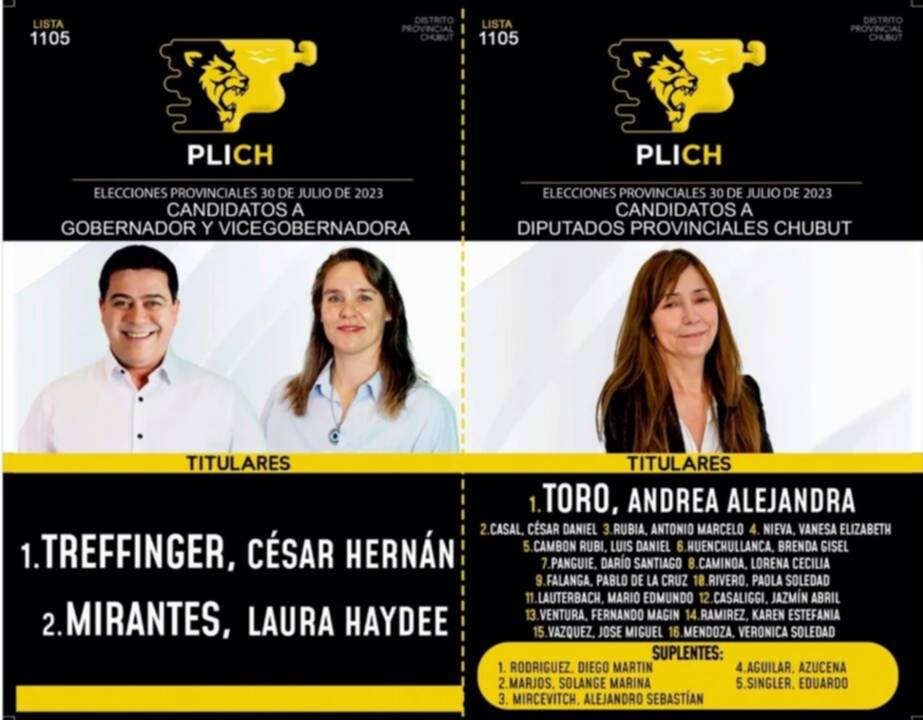 El frente Por la Libertad Independiente Chubutense, es la lista N° 1105, con el binomio César Treffinger y Laura Mirantes; tiene un fondo negro, con nombres en letras blancas, y el logo con el león que identifica a Javier Milei en amarillo. La imagen de Andrea Toro encabeza diputados provinciales.