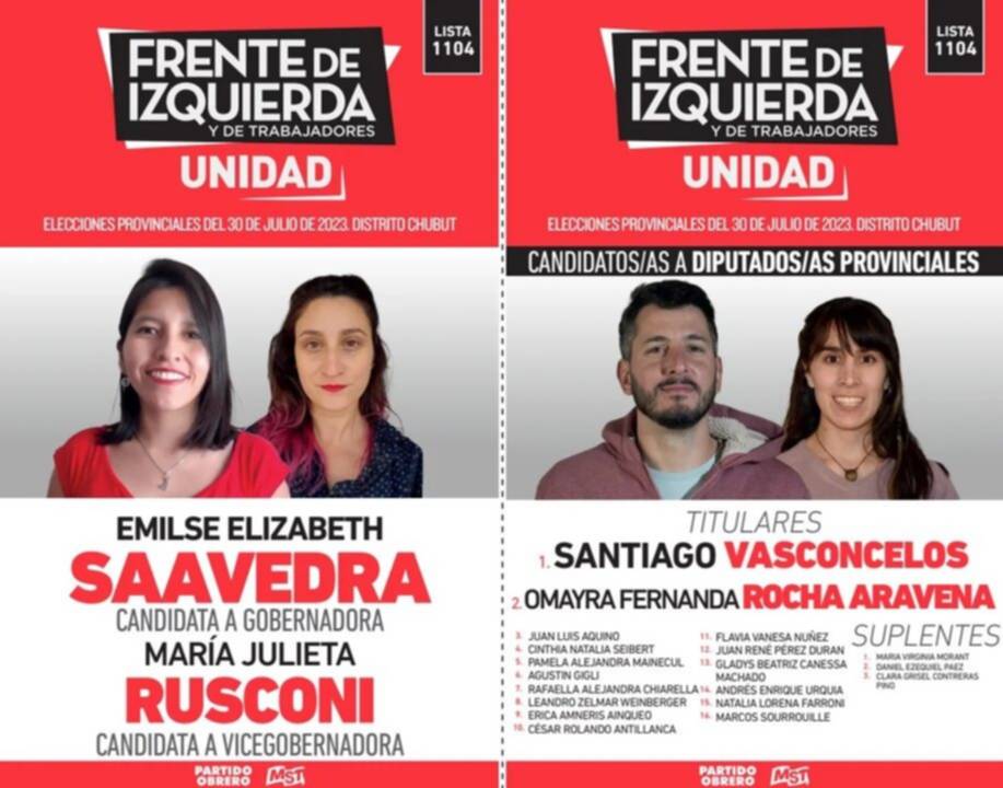 El Frente de Izquierda de los Trabajadores – Unidad, la boleta tiene el número 1104 y los colores predominantes son rojo y blanco, con las letras negras. Tiene foto doble en ambas categorías: Emilse Saavdera y Julieta Rusconi en gobernador y vice; y Santiago Vasconcelos y Omayra Rocha en diputados.