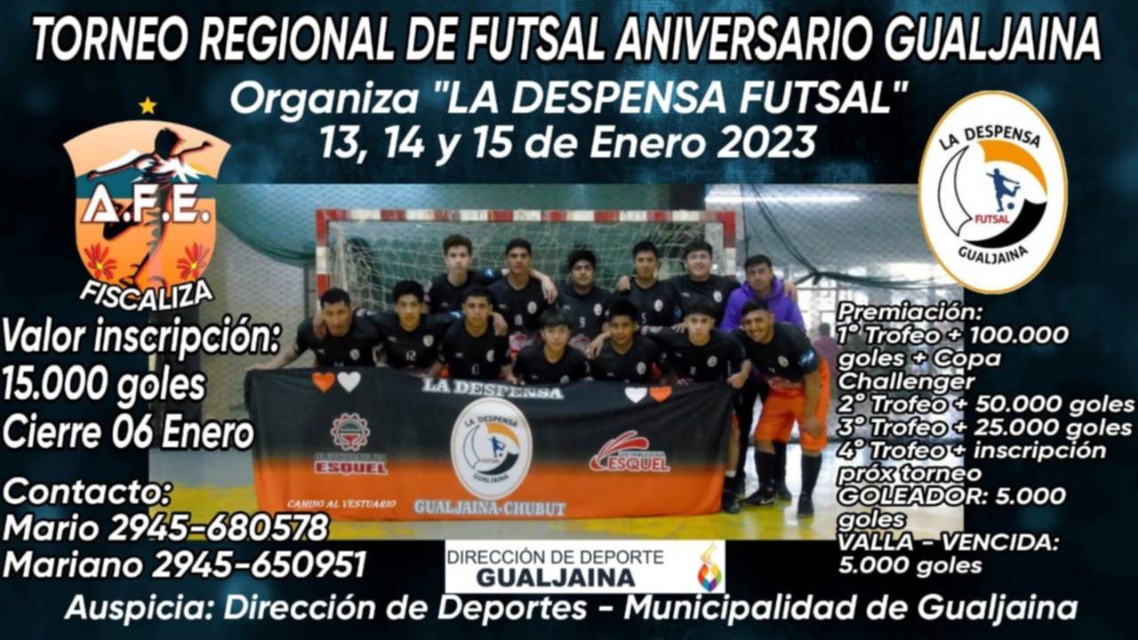 Organizado por el elenco de La Despensa Futsal y con el auspicio de la dirección de deportes de Gualjaina se llevará a cabo a este torneo que entregará un total de premios, en dineros en efectivo, de 185 mil pesos.