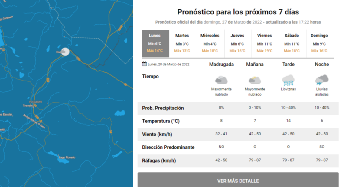 Según el Servicio Meteorológico Nacional, la semana arrancará en Esquel con un día nublado y probabilidad de lloviznas por la tarde y lluvias aisladas durante la noche.