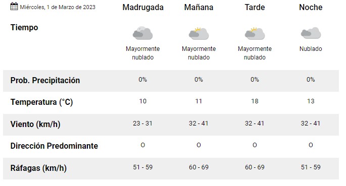 Se espera una jornada con nubes y ráfagas de viento durante la tarde.