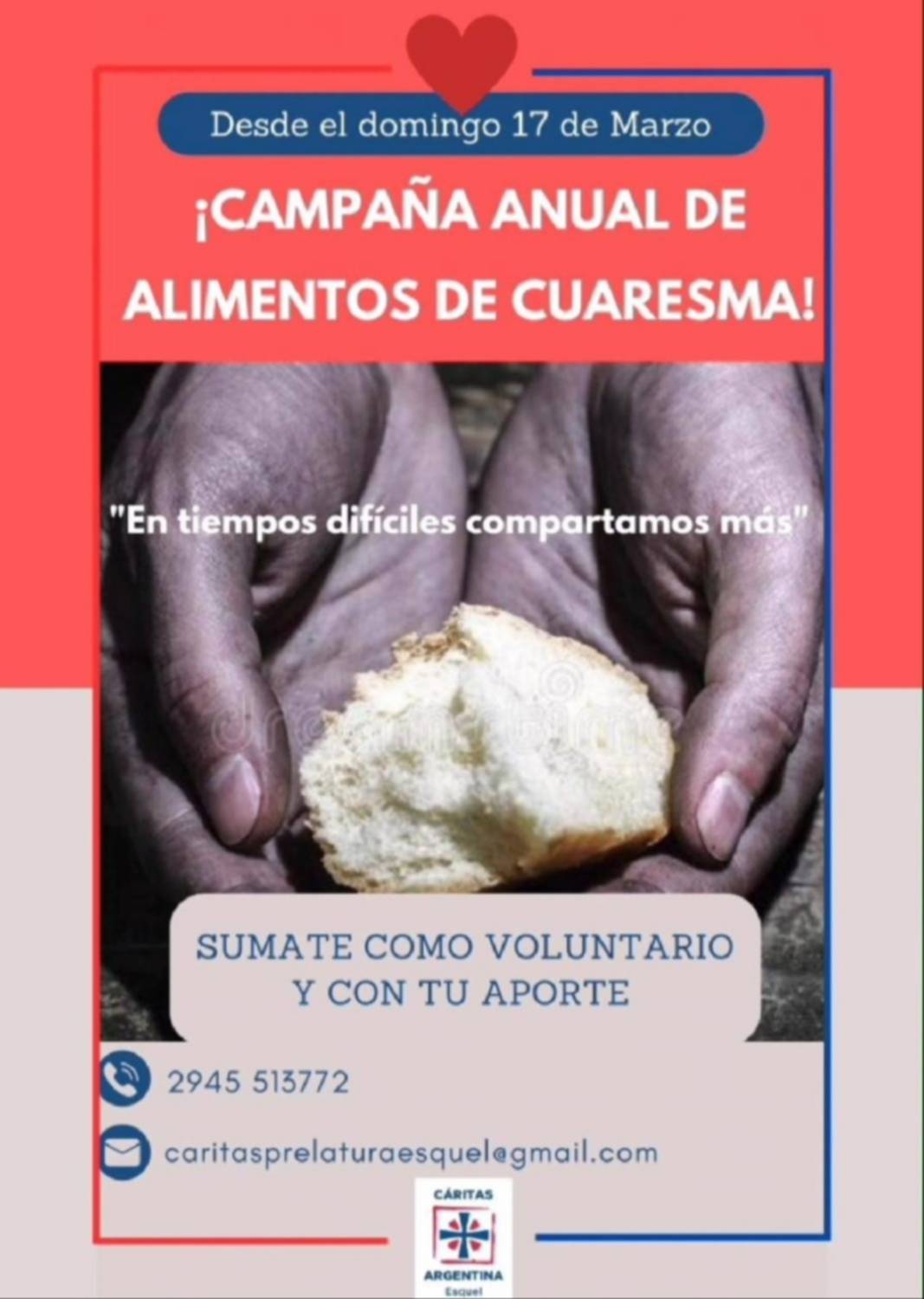 Desde Cáritas Prelatura Esquel se lanzó una convocatoria para todos aquellos que quieran colaborar con alimentos no perecederos en tiempo de Cuaresma.