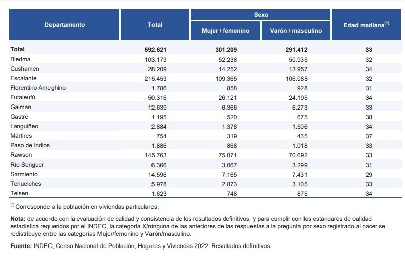 La población de Chubut es 592.621 habitantes, de los cuales 301.209 son mujeres y 291.412 son varones. La edad promedio es 33 años.