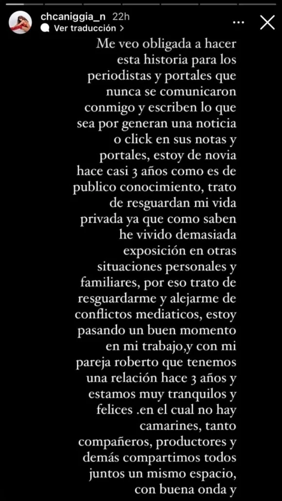 “Estoy de novia hace casi 3 años, como es de público conocimiento. Trato de resguardar mi vida privada ya que, como saben, he vivido demasiada exposición en otras situaciones personales y familiares, por eso trato de resguardarme y alejarme de conflictos mediáticos”, agregó.