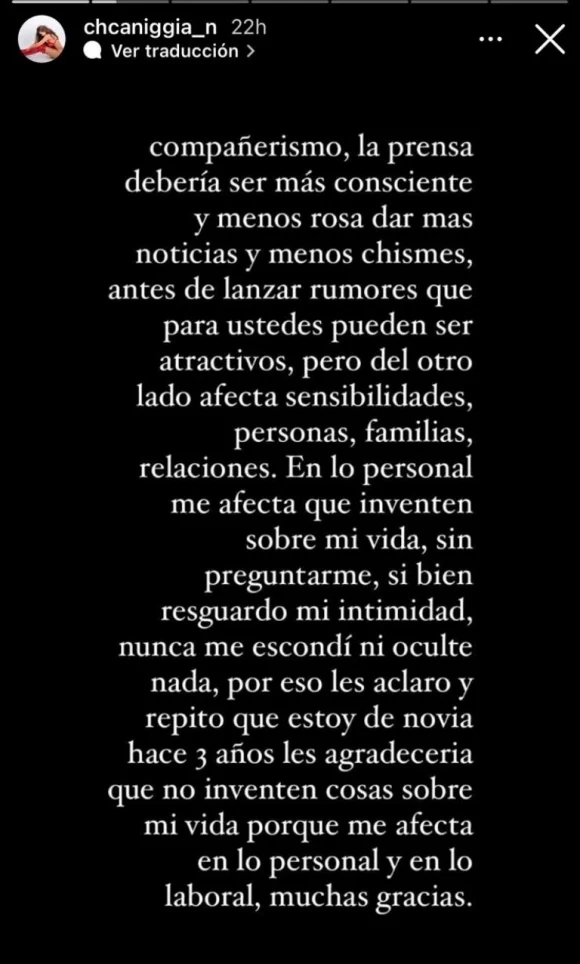 Y cerró, sin vueltas: “En lo personal me afecta que inventen sobre mi vida, sin preguntarme. Si bien resguardo mi intimidad, nunca me escondí ni oculté nada. Por eso aclaro y repito que estoy de novia hace tres años y les agradecería que no inventen cosas sobre mi vida porque me afecta en lo personal y laboral. Muchas gracias”.