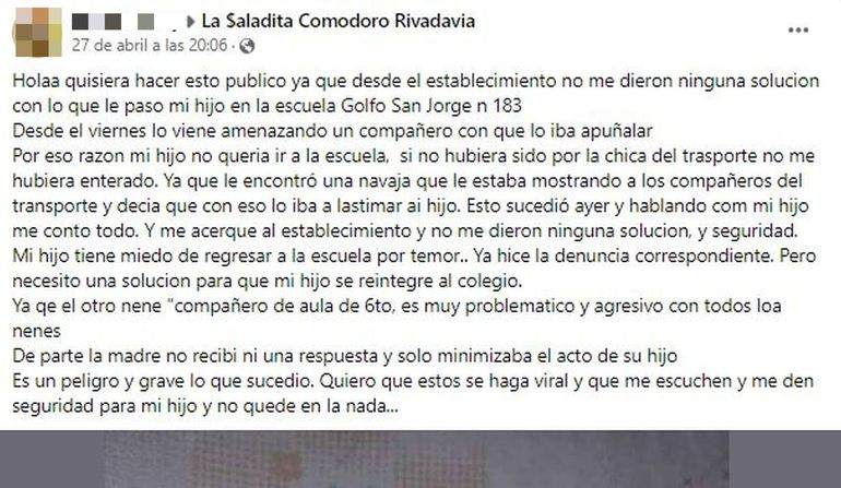 La mujer radicó la denuncia en la Seccional Quinta y afirmó a través de una publicación en su cuenta de Facebook que “desde el viernes lo viene amenazando un compañero con que lo iba apuñalar y por esa razón mi hijo no quería ir a la escuela”. Asimismo, manifestó que se enteró de la situación por la conductora del transporte escolar, quien “le encontró una navaja que le estaba mostrando a los compañeros del transporte y decía que con eso lo iba a lastimar a mí hijo. Esto sucedió ayer (martes) y hablando con mi hijo me contó todo”.