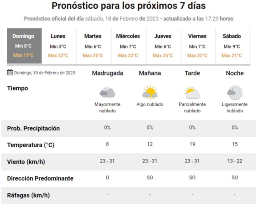 Según el pronóstico del tiempo del Servicio Meteorológico Nacional, para hoy se espera una máxima de 19°C.