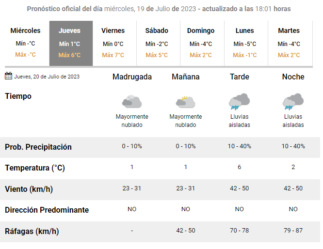 Según los datos del Servicio Meteorológico Nacional, para este jueves se espera una mínima de 1°C por la mañana y la máxima de 6°C durante la tarde.