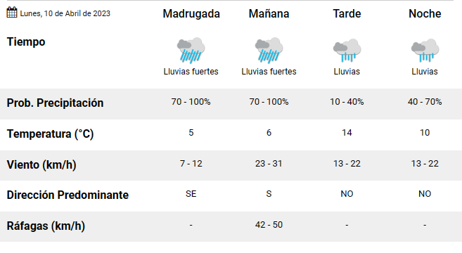 La jornada comienza con lluvias fuertes acompañadas de vientos de 23 y 31 kilómetros. En horas de la tarde, continuarán las precipitaciones hasta la noche, con una temperatura de 10°C.