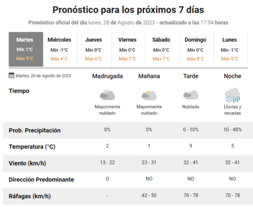 De acuerdo al SMN, la temperatura máxima prevista para este martes será de 9°C mientras que la mínima será de 1°C.