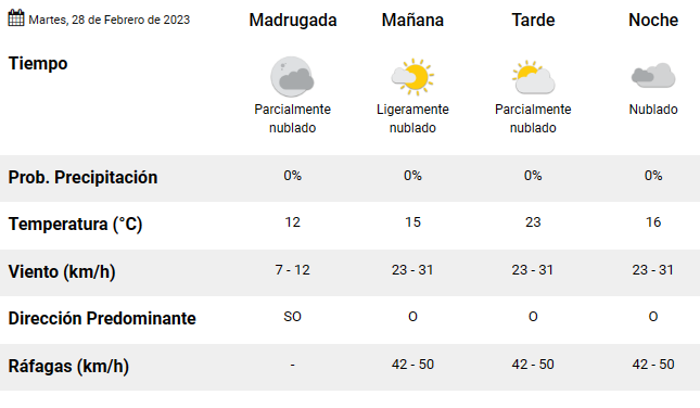 La jornada comienza con un cielo ligeramente nublado, acompañado de vientos de 23 y 31 kilómetros. En horas de la tarde, la temperatura será de 23°C, mientras que a la noche el cielo estará nublado.