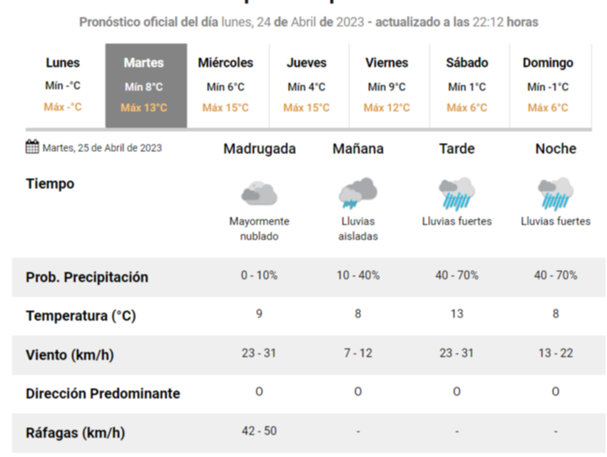 Según los datos del Servicio Meteorológico Nacional, el pronóstico para este martes 25 de abril indica que bajará la temperatura y hay ampliar probabilidad de lluvias.