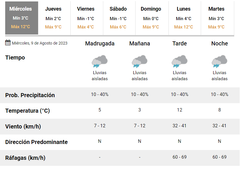 Además, en coincidencia con los días anteriores, no será una jornada muy fría. La mínima temperatura mínima será de 3°C y la máxima está prevista en 12°C.