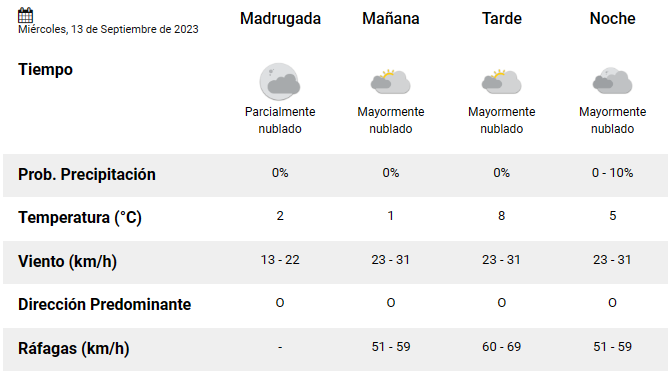 La jornada comienza con un cielo mayormente nublado, acompañado de vientos de 23 y 31 kilómetros. En horas de la tarde se esperan temperaturas de 8°C, mientras que a la noche descenderán a 5°C.