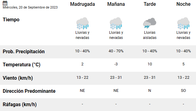 La jornada comienza con lluvias y nevadas acompañadas de vientos de 23 y 31 kilómetros. En horas de la tarde, habrá lluvias aisladas con una temperatura de 10°C.