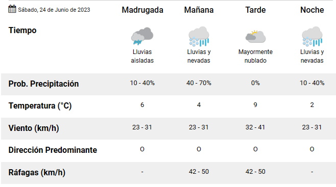 La jornada comienza con lluvias y nevadas, acompañadas de una temperatura de 4°C. En horas de la tarde, habrá vientos de 32 y 41 kilómetros con un cielo mayormente nublado, mientras que a la noche volverán las lluvias y nevadas.