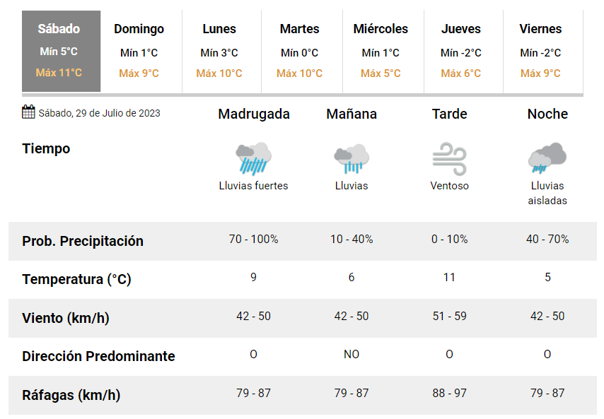 De acuerdo a los datos del sitio meteorológico de la Nación, las alertas son por lluvias fuertes durante madrugada y mañana y viento en la mayoría del día.