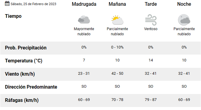 La jornada comienza con una temperatura de 10°C. En horas de la tarde se esperan vientos de 32 y 41 kilómetros, mientras que a la noche el cielo estará parcialmente nublado.