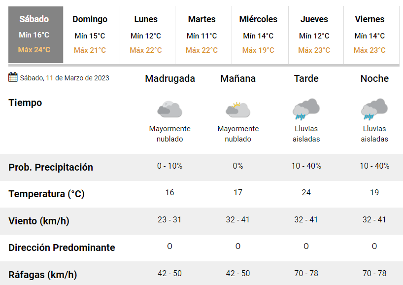 Por la tarde y noche se esperan ráfagas de viento cercanas a los 80 km/h.