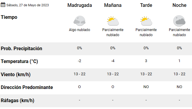 La jornada comienza con un cielo parcialmente nublado y con una temperatura de -4°C. En horas de la tarde, la temperatura subirá a 3°C, mientras que a la noche bajará a 1°C.
