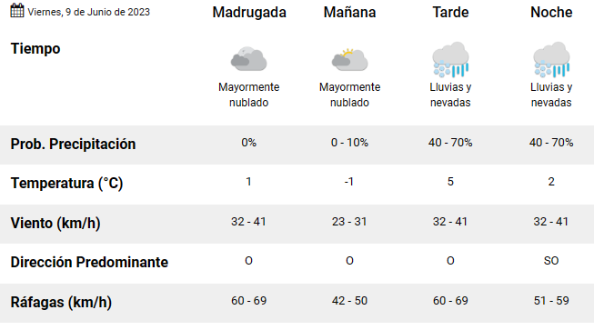 La jornada comienza con un cielo mayormente nublado con vientos de 23 y 31 kilómetros. En horas de la tarde, se registrarán lluvias y nevadas que continuarán hasta la noche con una temperatura de 2°C.