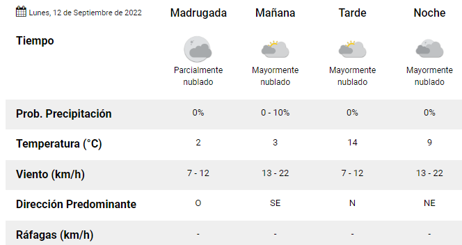 La jornada comienza con un cielo mayormente nublado. En horas de la tarde se espera una temperatura de 14°C, mientras que a la temperatura bajará a 9°C y estará acompañada por vientos de 13 y 22 kilómetros.