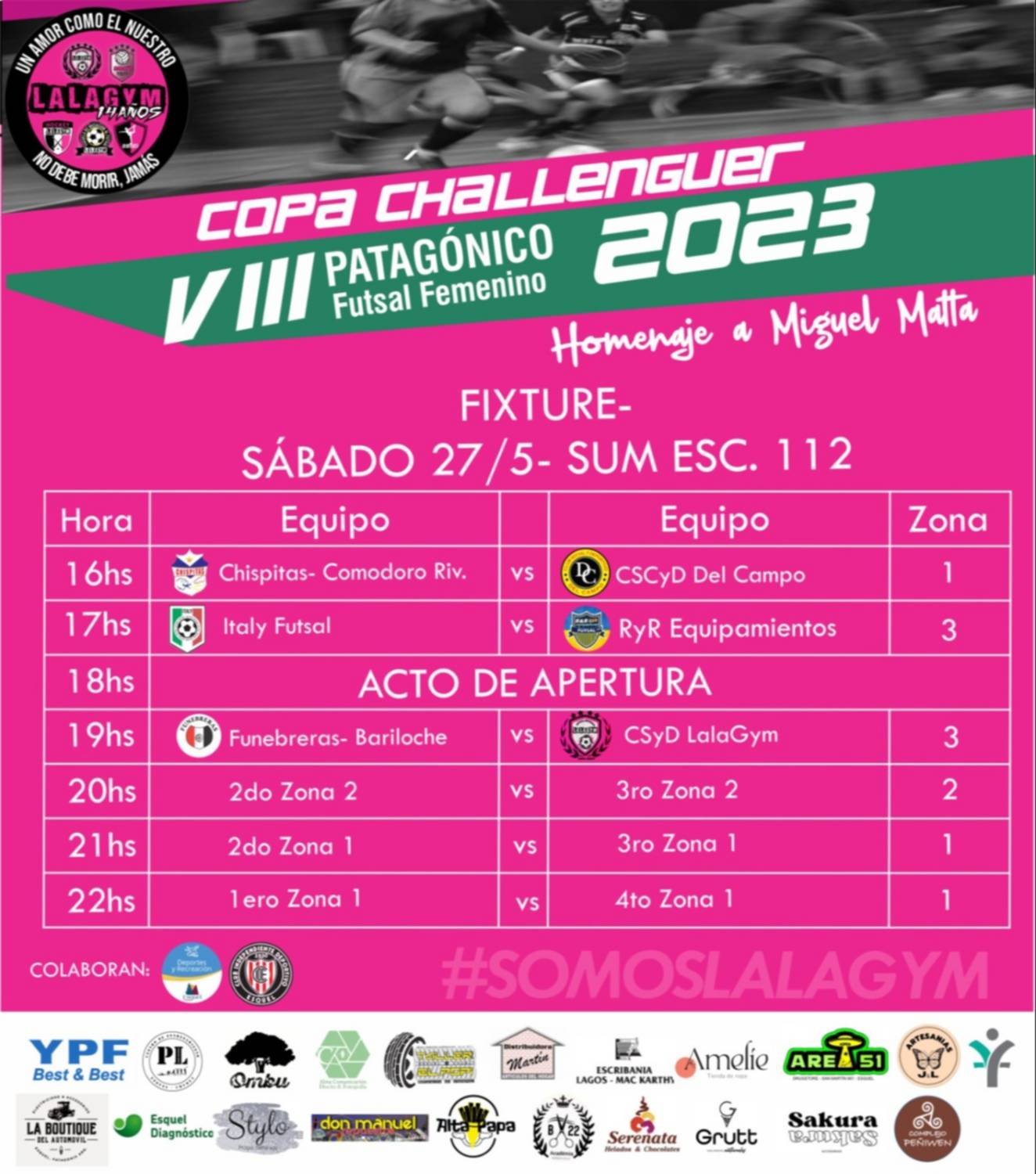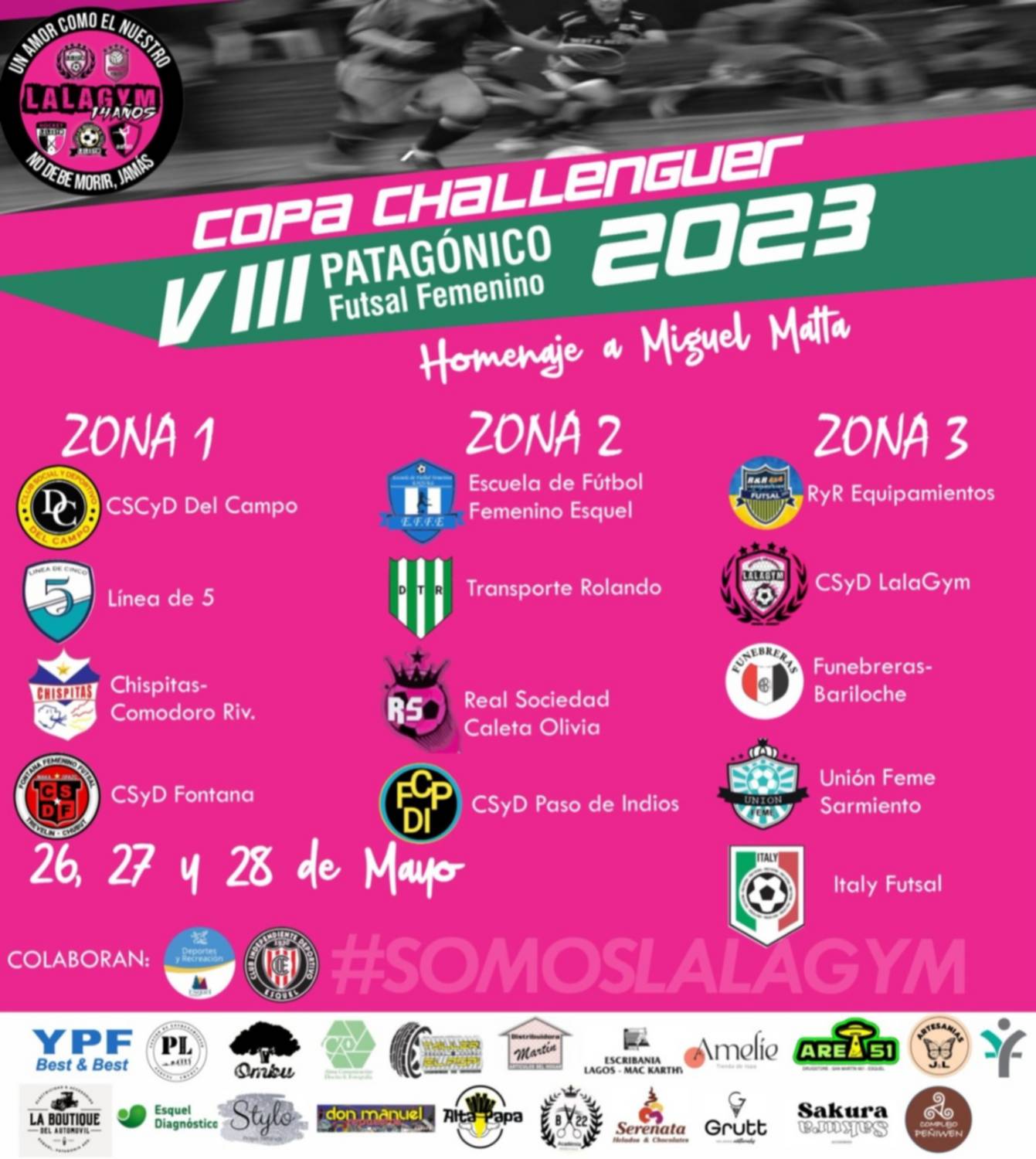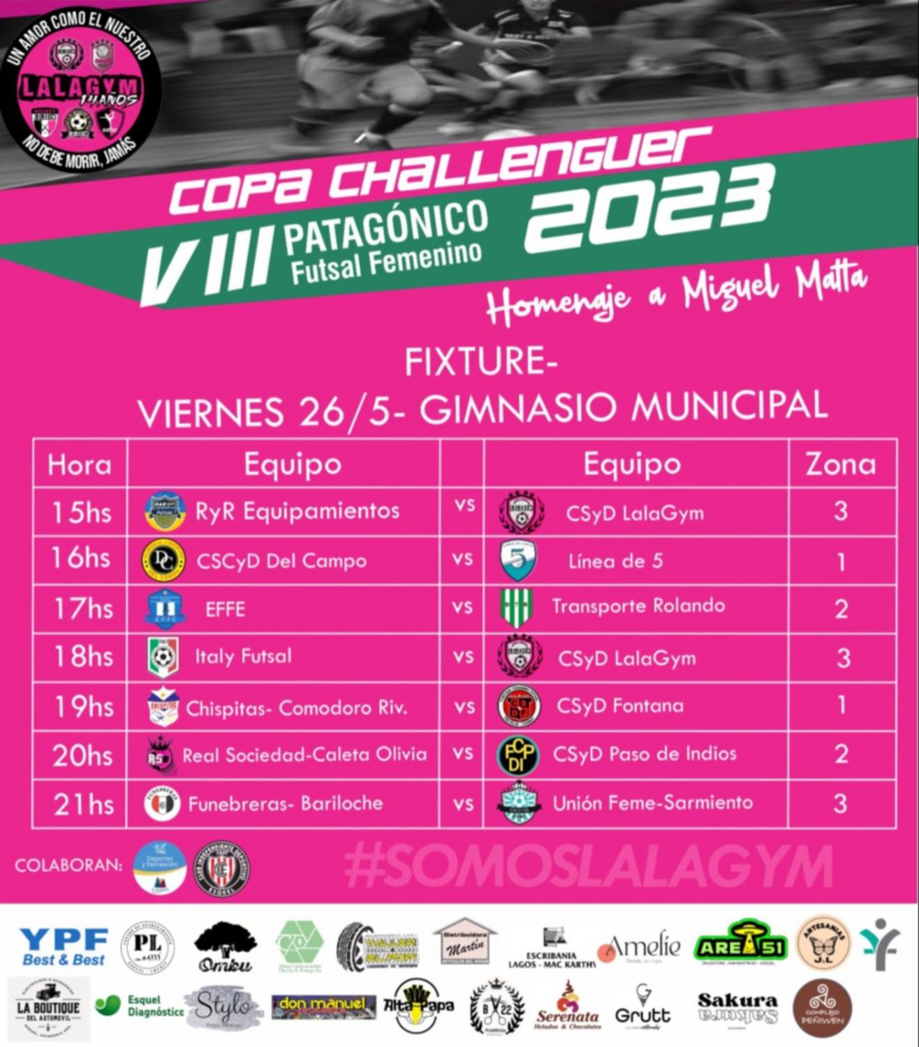 Llegó el día para las chicas que juegan futsal. Es que a partir de hoy y hasta el domingo se llevará a cabo el Torneo Patagónico de Futsal Femenino, que tendrá el nombre de “Miguel Matta”, competencia organizada por Lala Gym.