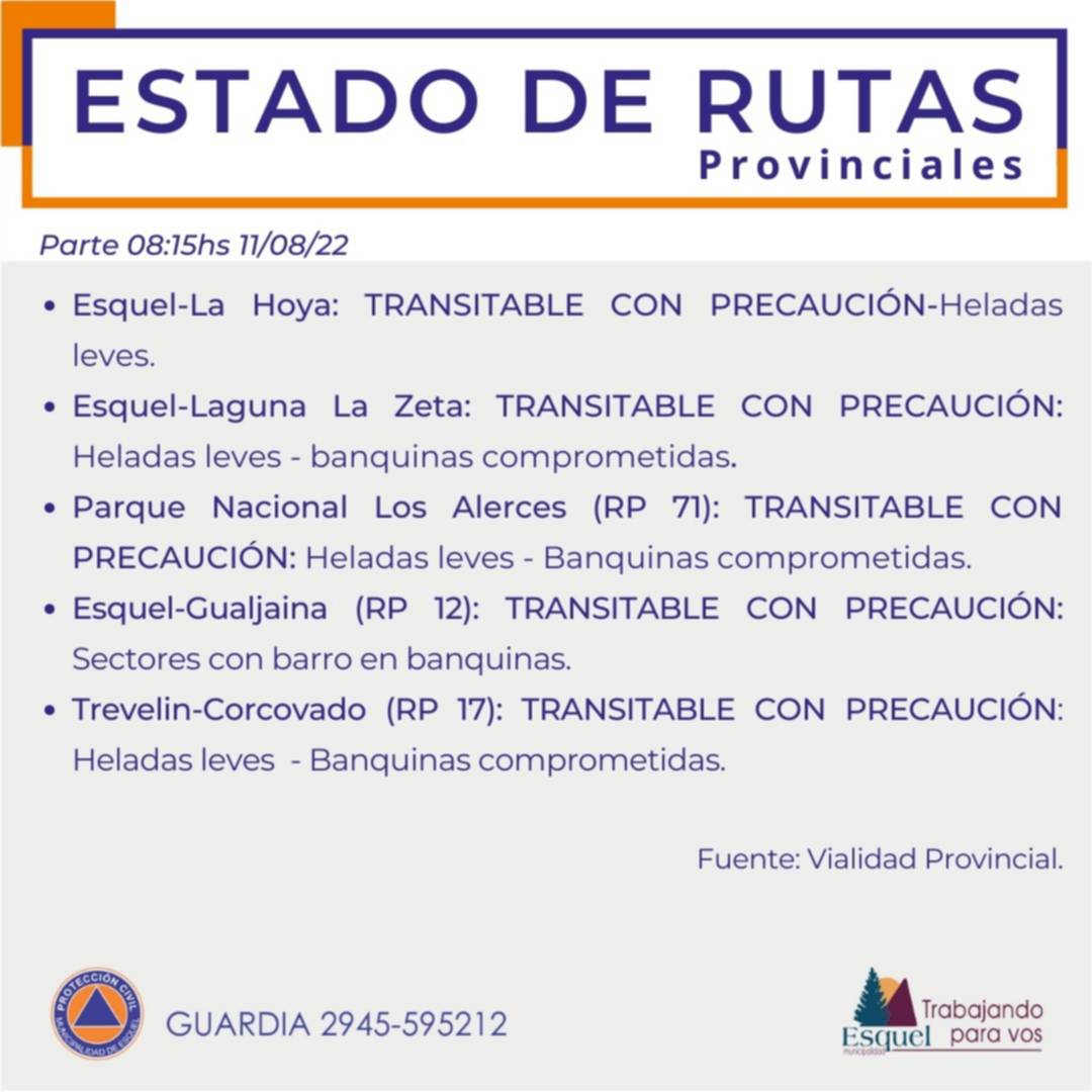 En este marco, informaron que la ruta Nº 259 hacia Trevelin se encuentra transitable. La calzada se encuentra normal y húmeda en determinados sectores por el riego con sal.