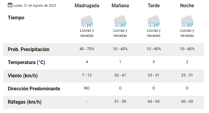 Continúa, al igual que durante el fin de semana, el pronóstico de lluvias y nevadas para esta jornada, con algo de viento en horas de la tarde.