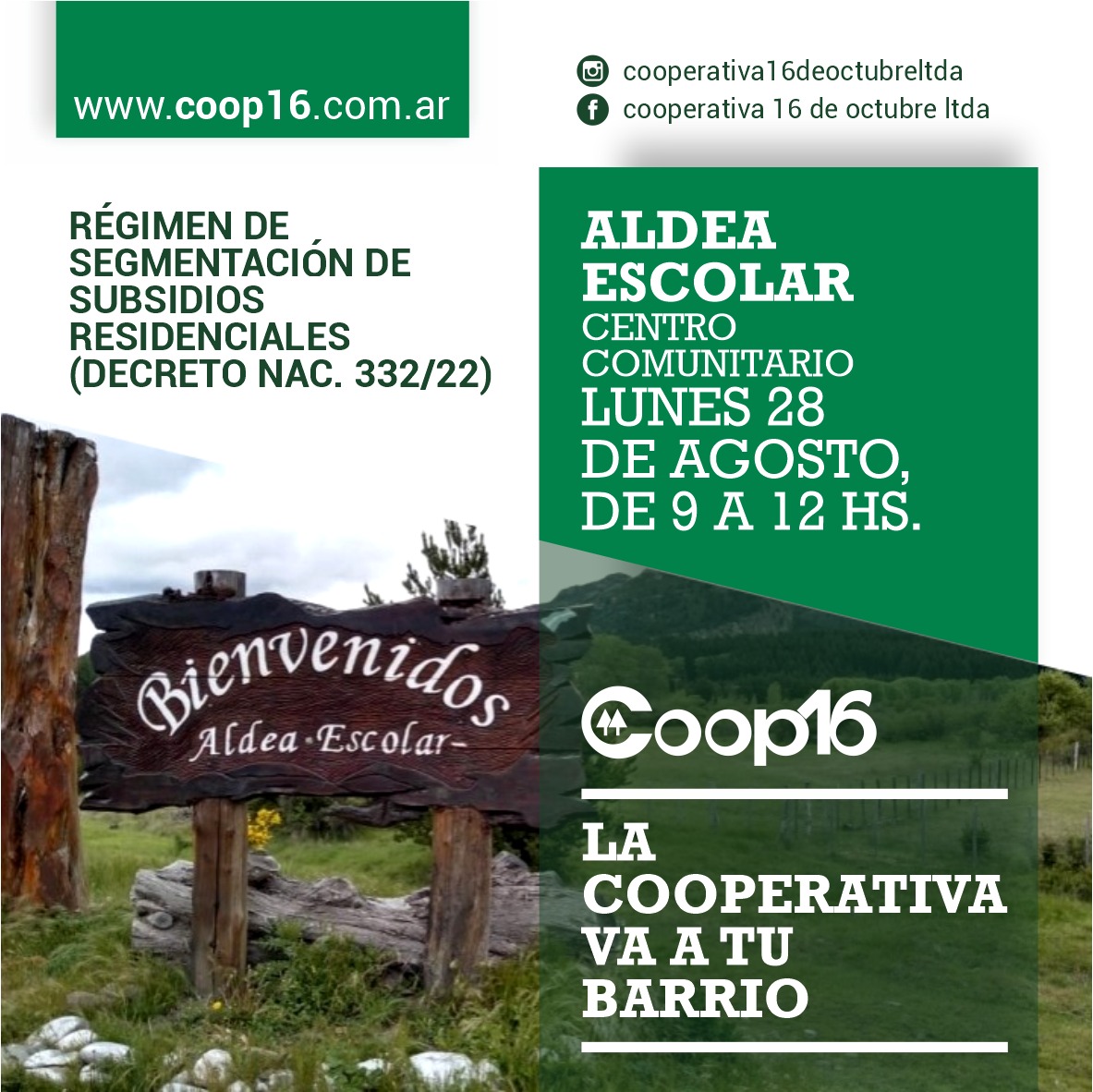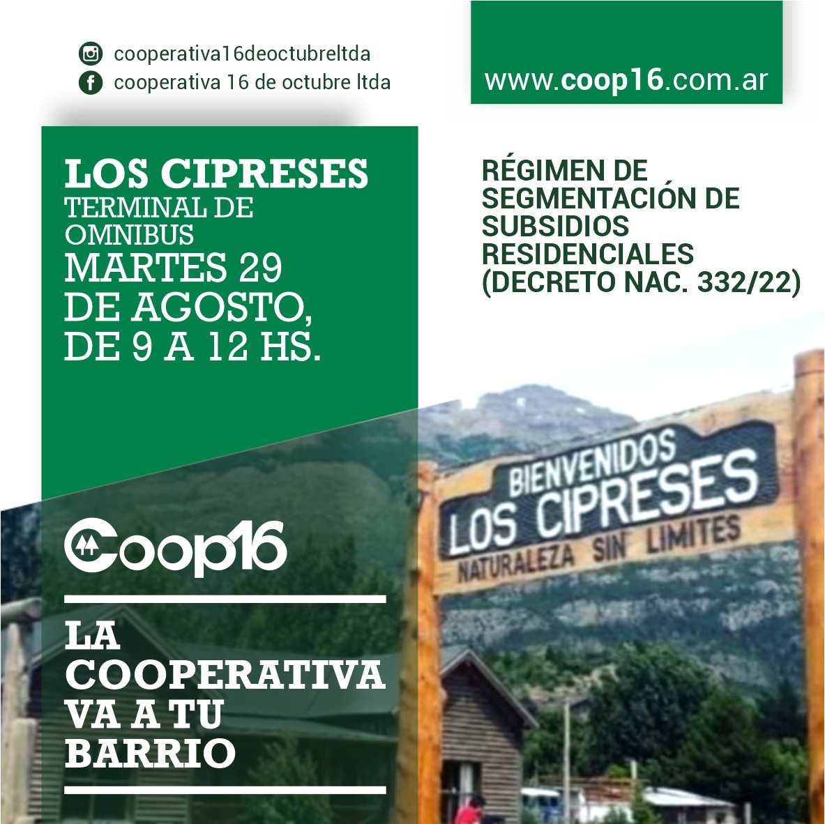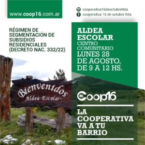 Hoy lunes 28 en el horario de 09 a 12 horas, en la Terminal de ómnibus de Los Cipreses, y mañana martes 29 en el mismo horario, en el Centro Comunitario de Aldea Escolar, personal de la Coop. 16 estará inscribiendo para ingresar al Régimen de Segmentación de Subsidios Residenciales (Decreto Nac. 332/22)