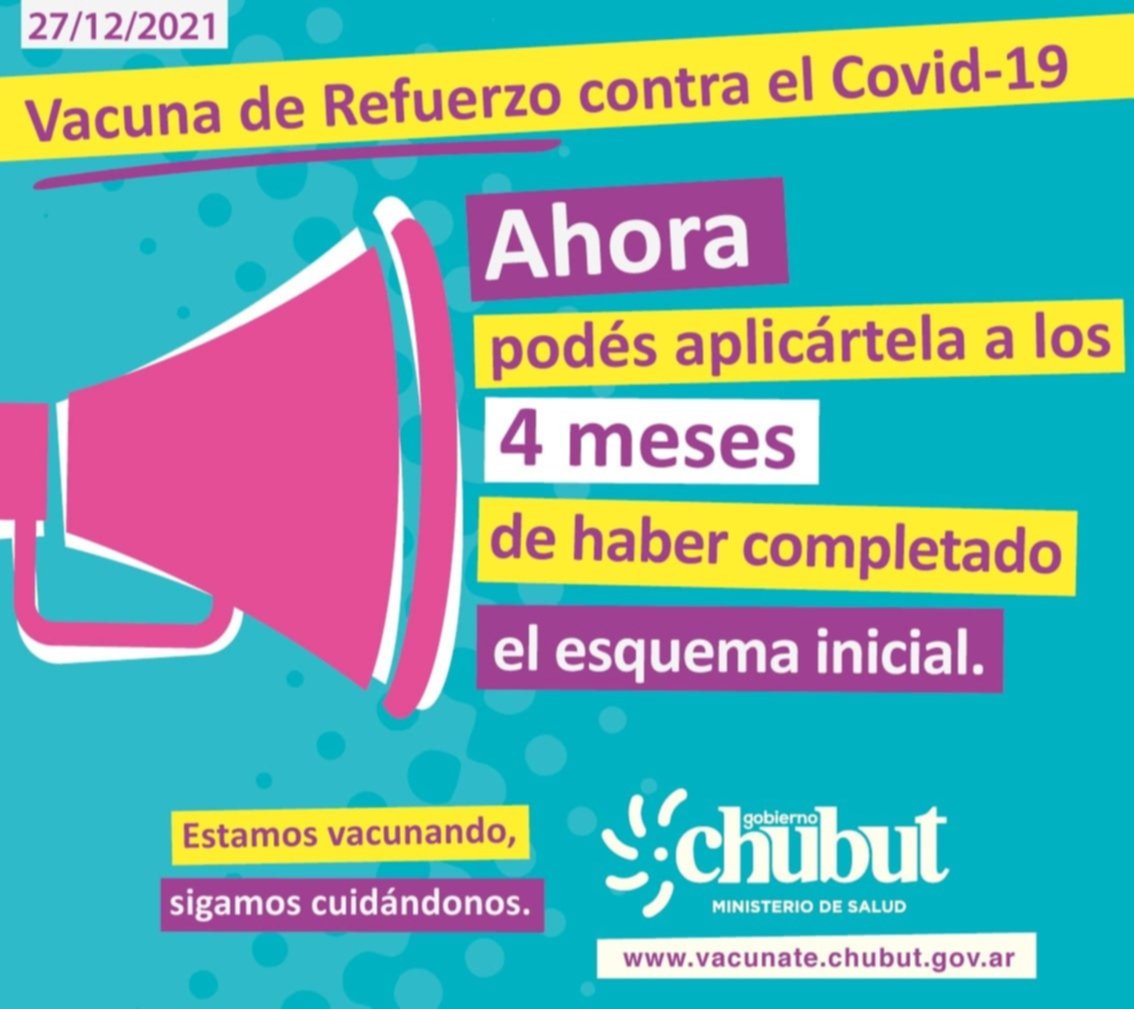 Desde el Área Programática Esquel, dependiente del Ministerio de Salud de la provincia, informaron que todas las personas que hayan pasado los 4 meses de haber recibido su segunda vacuna contra el COVID-19, pueden aplicarse la dosis de refuerzo sin turno previo.