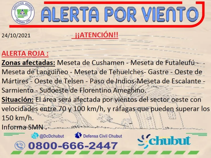 El Gobierno del Chubut fue notificado a través del SINAGIR (Sistema Nacional para la Gestión Integral del Riesgo) que el alerta por vientos se elevó a rojo, con lo cual se esperan fenómenos meteorológicos excepcionales.
