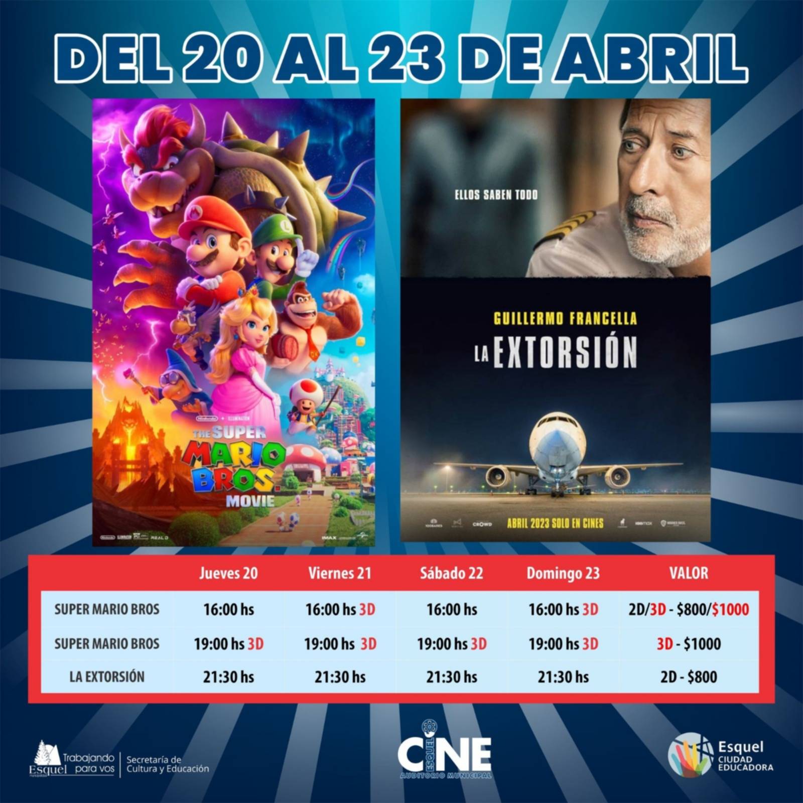 Las funciones serán desde el jueves 20 al domingo 23 de abril. En el caso de «Super Mario Bross» se proyectará a las 16 y a las 19 horas en 2D y 3D. Al tanto que «La Extorsión» protagonizada por Guillermo Francella, se proyectará a las 21:30 horas en 2D.