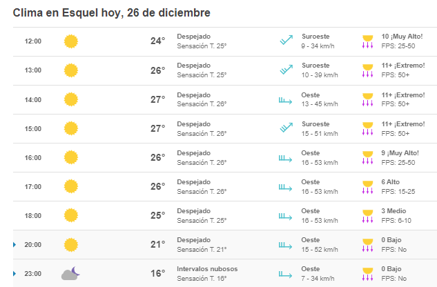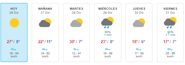 Según los datos que brinda la página oficial del Servicio Meteorológico Nacional, este domingo en la ciudad de Esquel, tendremos una temperatura máxima de 27°C.