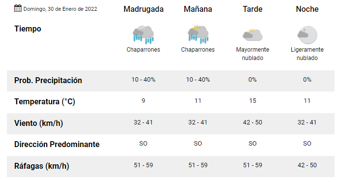Se espera cielo nublado, probabilidad de chaparrones y una temperatura máxima de 15°C.