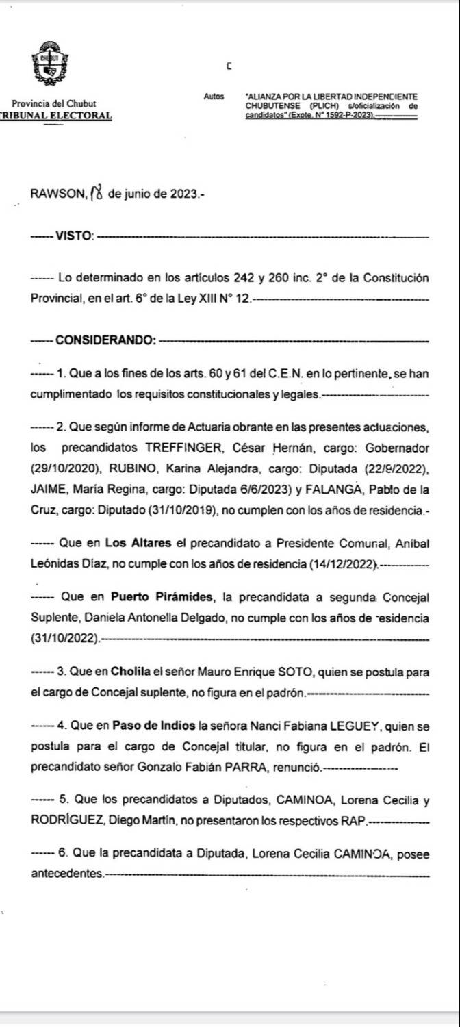 El Tribunal Electoral de la Provincia del Chubut descalifica al candidato a gobernador, César Hernán Treffinger, y a varios diputados de la Alianza Por la Libertad Independiente del Chubut (PLICH) por falta de residencia continua.