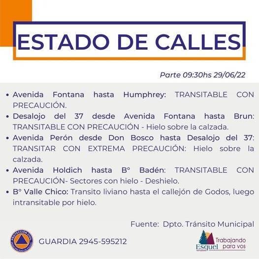 En este sentido, el municipio informó que se debe transitar con precaución sobre las calles Av. Fontana hasta Humphreys, Desalojo del ’37 desde Av. Fontana hasta Brun, y Av. Holdich hasta el Bº Badén debido a que se registran sectores con hielo y otros con deshielo.